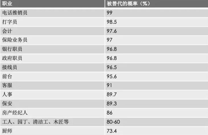 比如电话推销员、打字员等被替代率分别高达99%和98.5%。